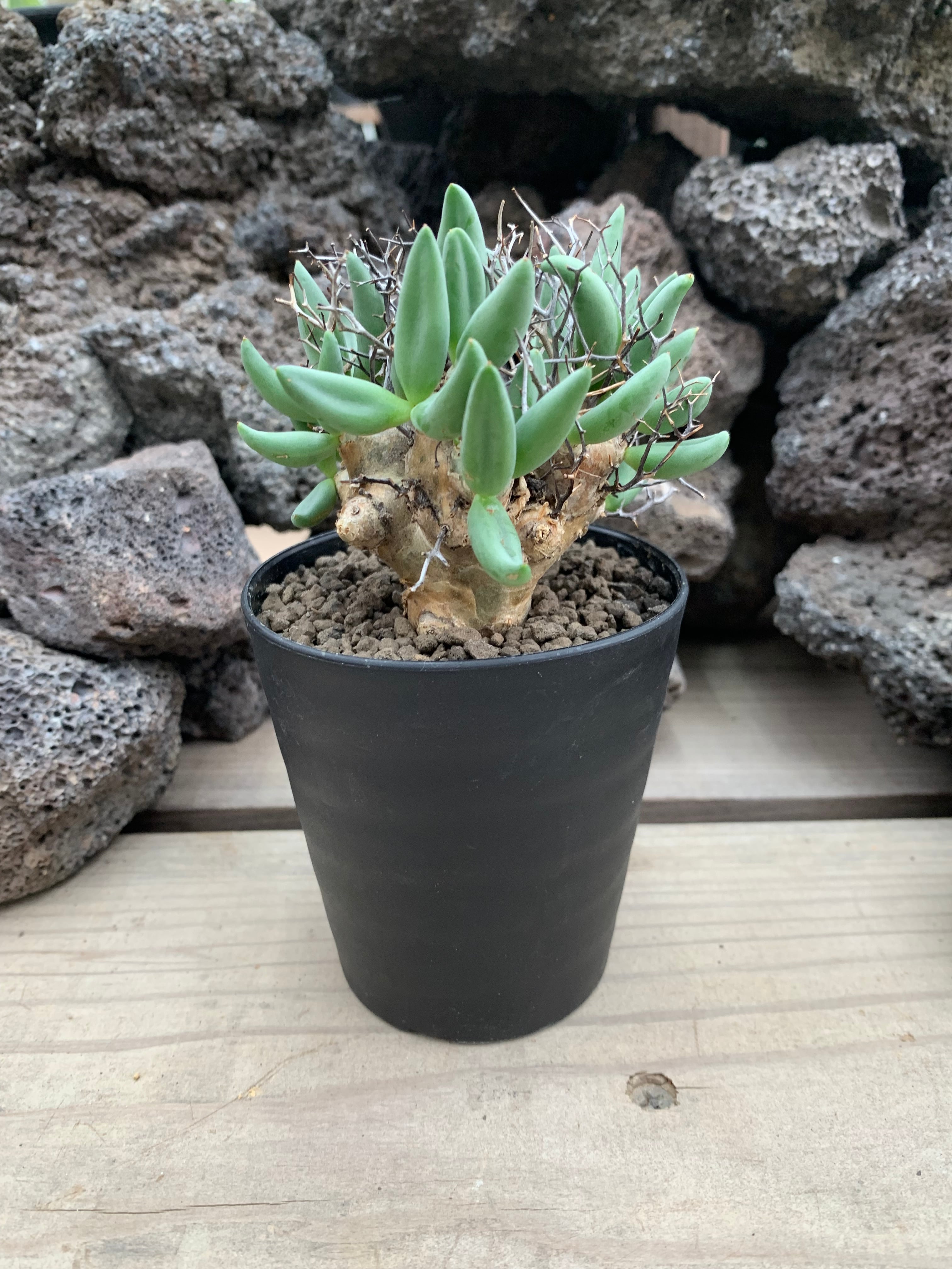古木感漂う幹が魅力的な塊根植物です。小さな花を咲かせた後、花柄の枯れた部分がそのまま残り、年数を重ねるごとに枝数も増えて大きく複雑な形になるところが最大の特徴で魅力です。