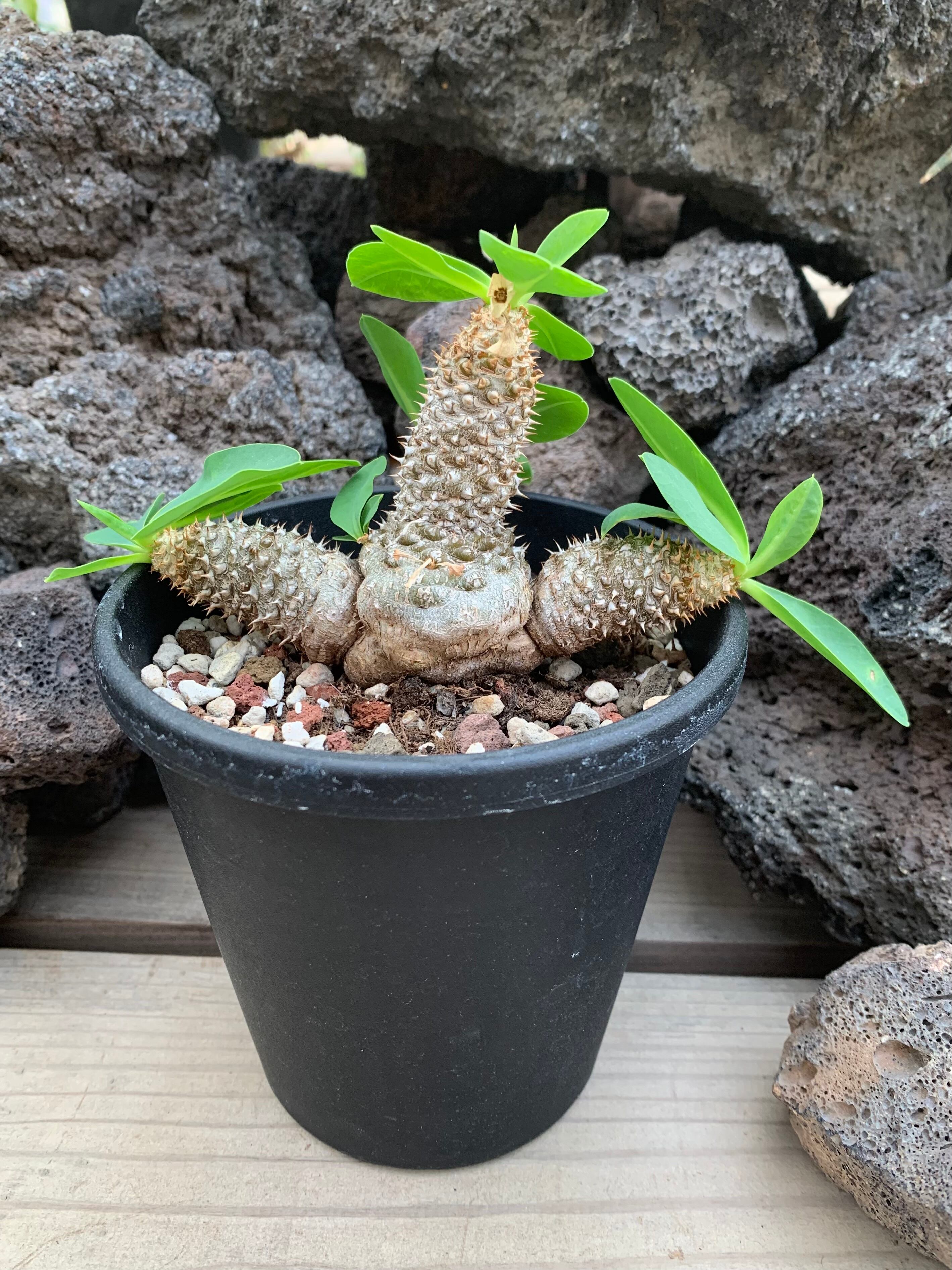 ★ユーフォルビア パルビメデューサエは、南アフリカ原産の魅力的な多肉植物です。メデューサの髪のように枝を広げるユニークな塊根植物。トゲのある無骨な幹と、先端に展開するやわらかな緑の葉のコントラストが魅力です。
