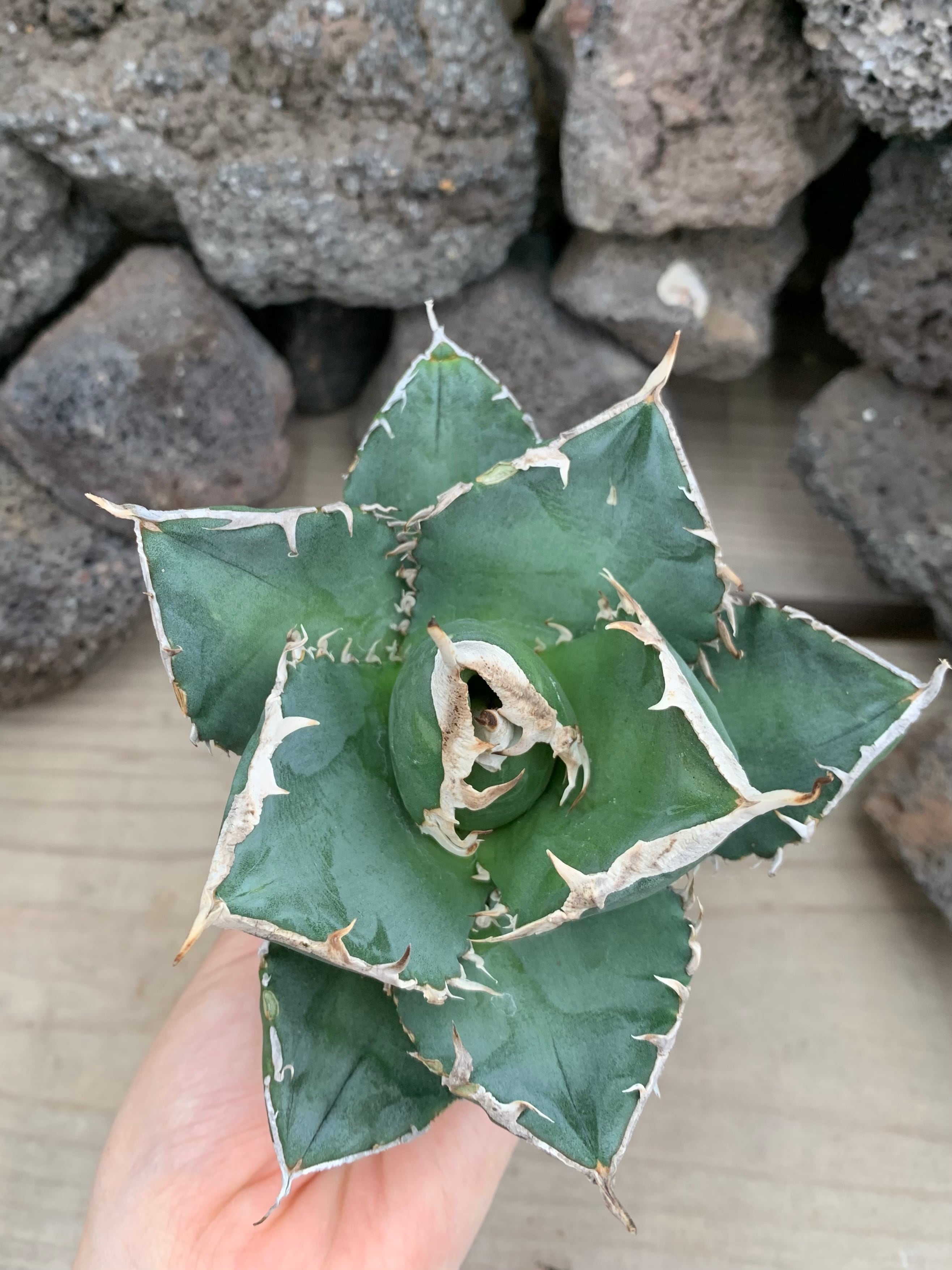 ★ アガベ SAD (ベアルート)は、メキシコの乾燥地に自生する注目のアガベです。この植物は、肉厚で独特な葉の形状を持ち、成長する白く鋭い鋸歯が美しい、コンパクトなロゼットを形成する人気のアガベです。成長するごとにその存在感が増します。