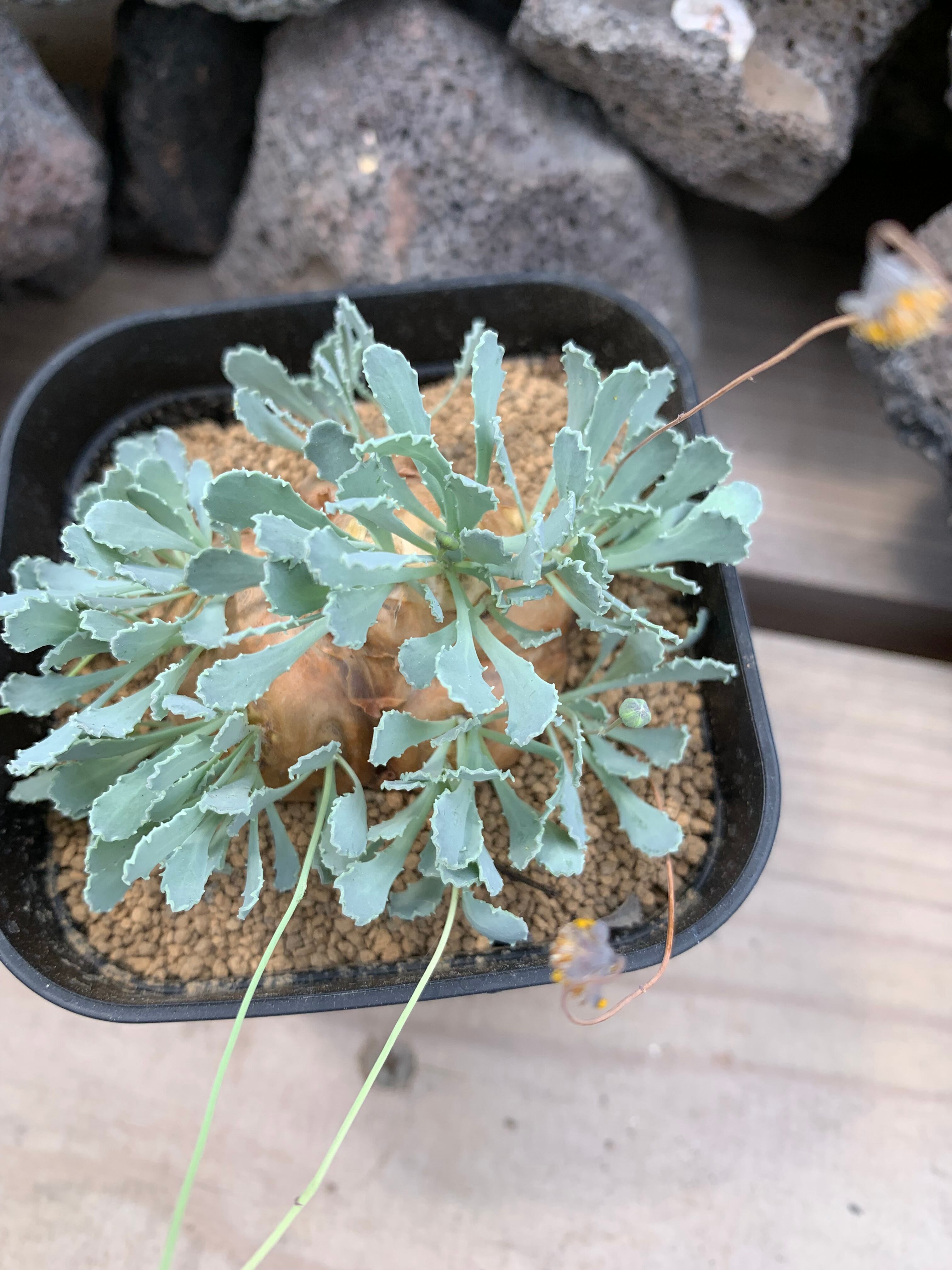 オトンナ カカリオイデスは、緑色の葉を持ち、全高は約10cmです。鉢のサイズは3号で、コンパクトながらも其の形状が目を引きます。リビングやデスク、窓辺に置くことで、どんなスペースもおしゃれに演出します。